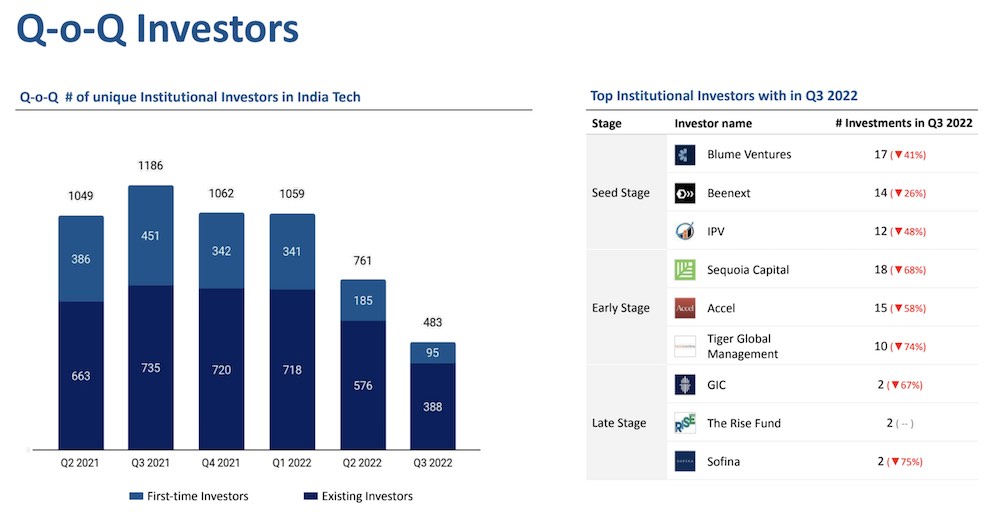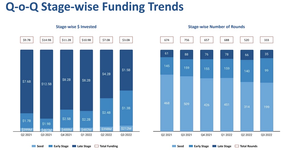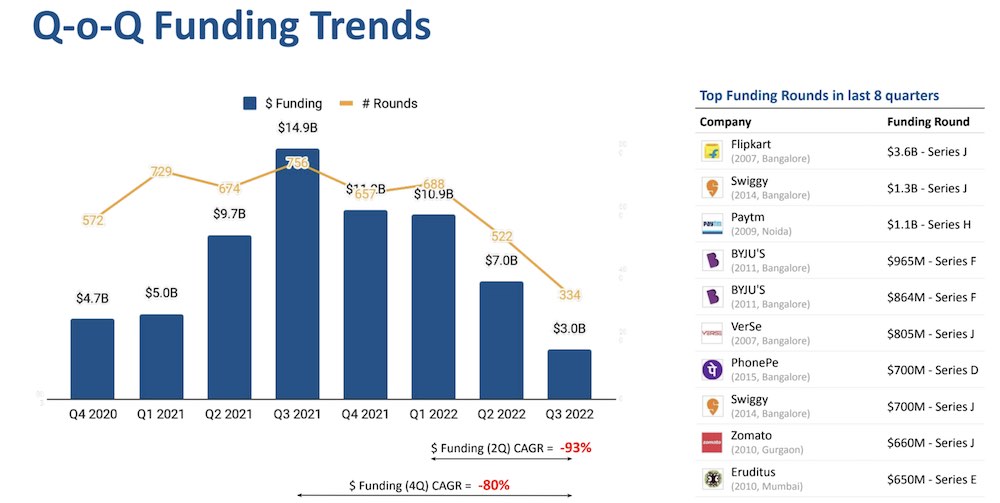 In Q3, the Indian startup ecosystem undertook 334 funding rounds, down from 674 in Q3 2021. The check sizes are also increasingly getting smaller for startups across all funding stages. Late stage startups that raised capital secured $42 million in funding on an average, down over 70% from $142 million during the same period last year, Tracxn said.