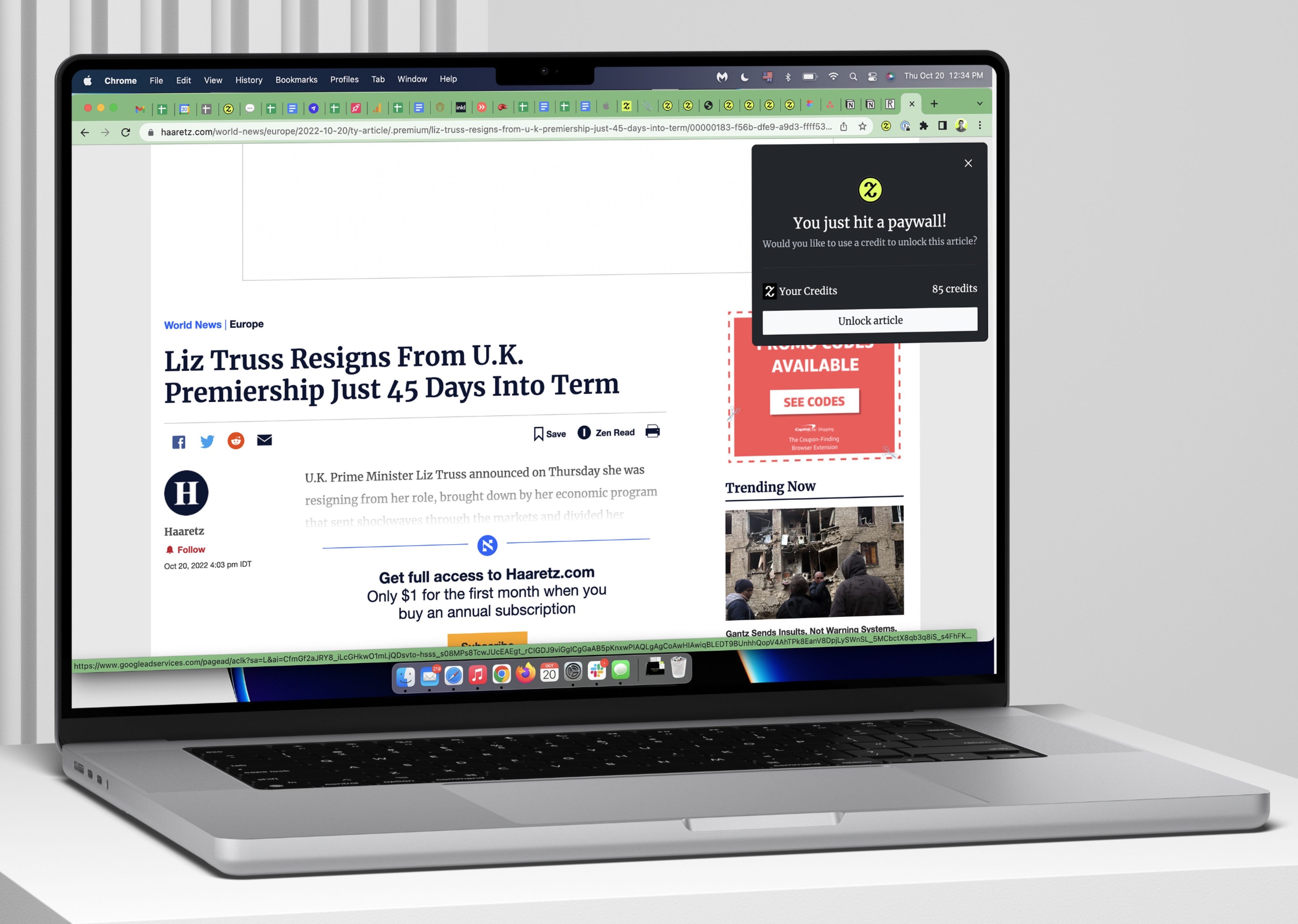 So, how does it all work? Well, the user downloads and installs a browser extension, signs up for a Zette account and subscription, and when Zette detects a paywall on a partner website, it invites the user to unlock the article by paying a single credit.