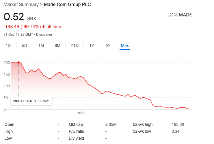 Today’s news comes a little more than a year after the London-headquartered company went public on the London Stock Exchange, a move that immediately saw its shares fall 7% on its first day of trading. Made.com priced its shares initially at 200 pence, giving it a valuation of around £775 million ($894 million), but its fortunes never quite recovered from that inaugural day in June 2021, as its stock continuing to plummet in the intervening months to an all-time low of 34 pence.