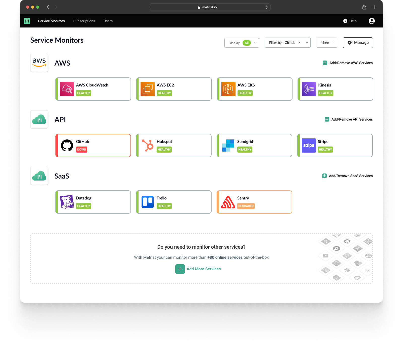 Metrist offers a free plan that allows you to monitor up to three services with one day of data retention. Paid plans start at $99/month for seven services and seven days of data retention.