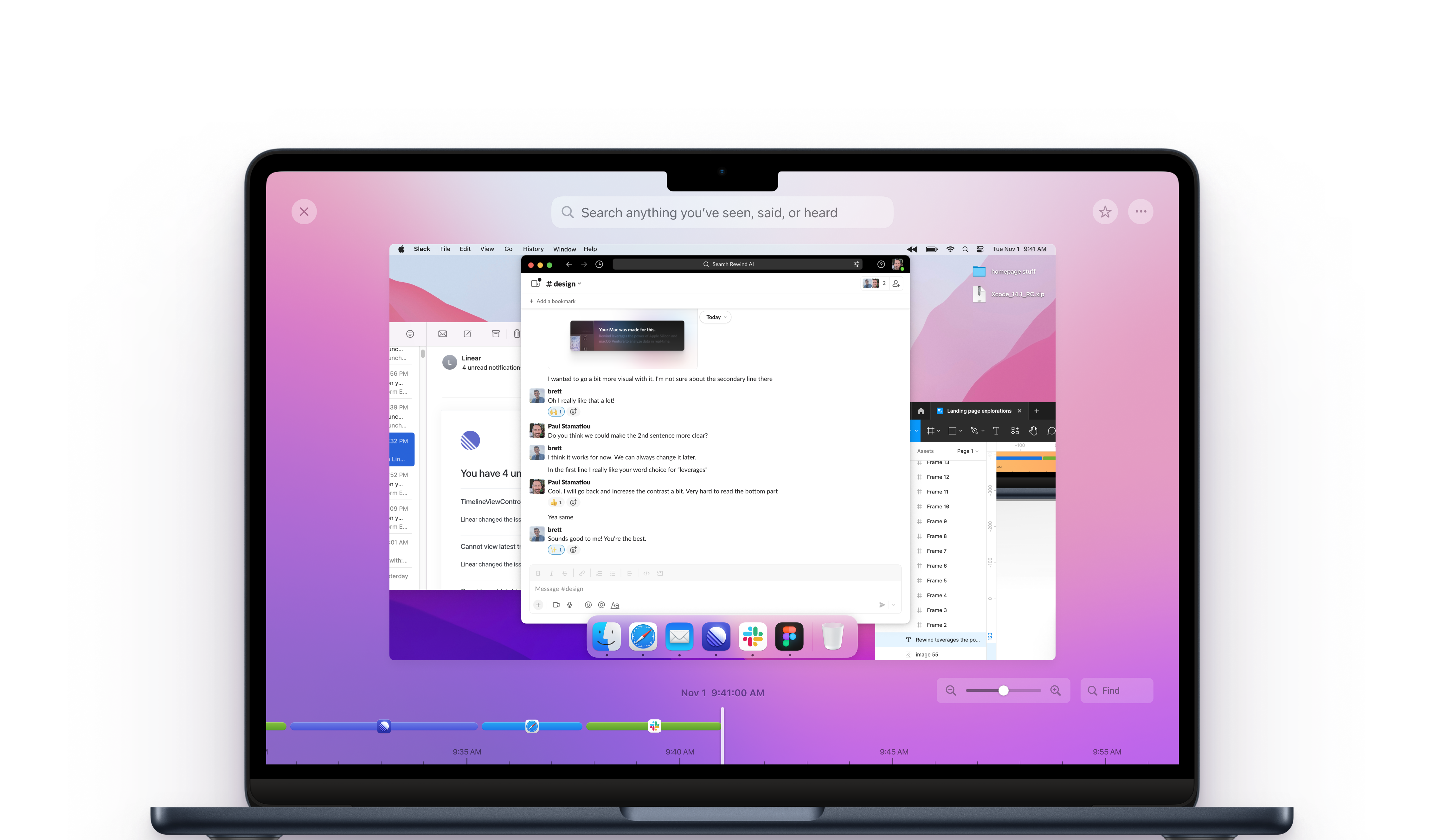 Users don’t need to integrate with Gmail, Dropbox or Slack, but instead just can download and “rewind” to start capturing the apps. Put in practice, if, for example, you forget the URL of the landing page of a new rival app that someone mentioned during a developer stand-up, you can rewind – haha – through your day, find the moment in the meeting someone threw the link on the screen, copy the link and paste.
